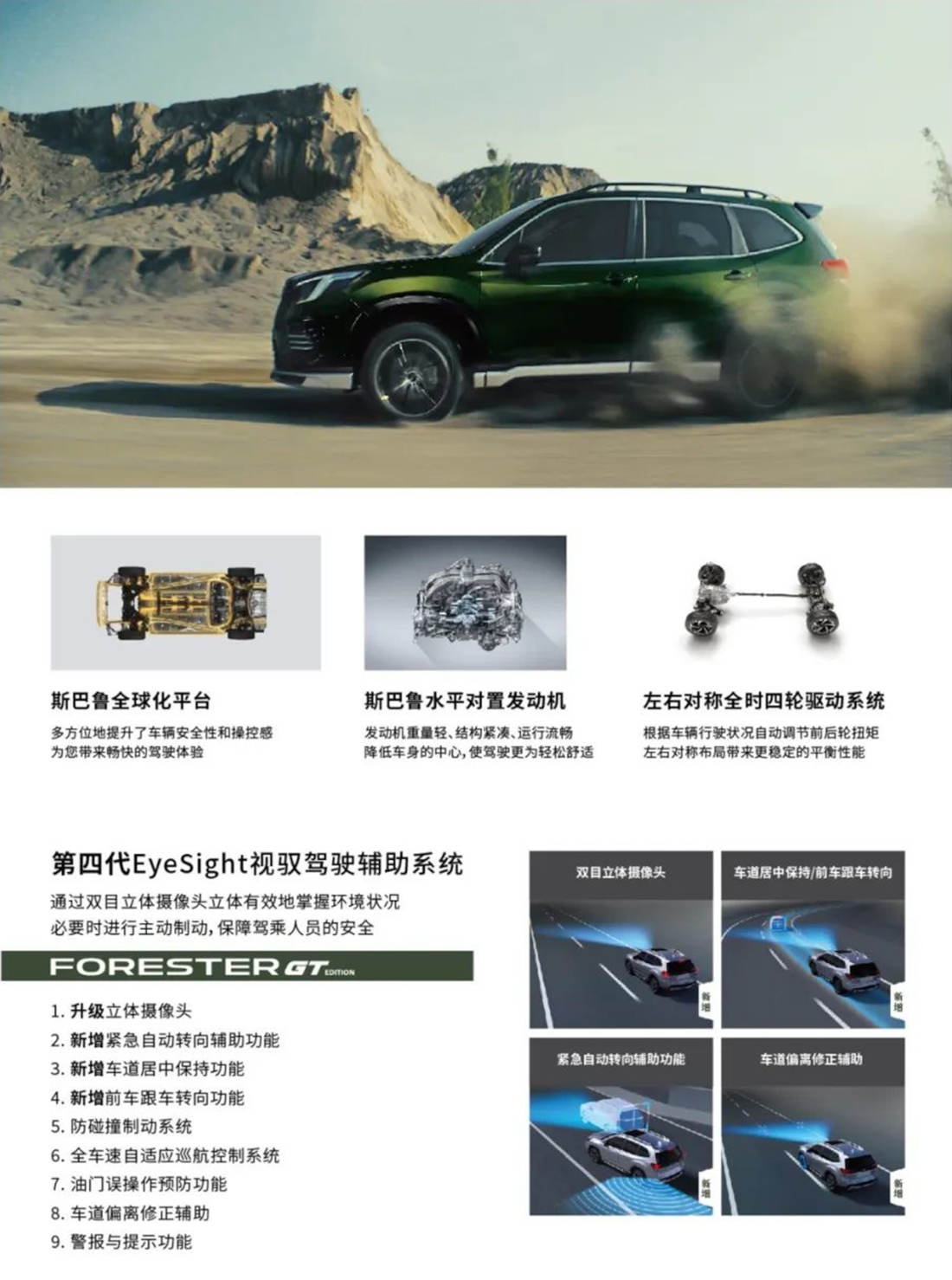 Forester森林人GT是根据斯巴鲁全球化平台研发而来的,因为有着高强度车架、低重心设计以及全时四驱、第四代EyeSight视驭驾驶辅助系统等百项安全配置的加持,这也造就了它十足的安全品质。第四代EyeSight视驭驾驶辅助系统,全新研发的双目立体摄像头,视野大幅扩展至2倍,识别更精准;新增“紧急自动转向辅助功能”,“车道居中保持/前车跟车转向功能”,提前预测,实现防碰撞。