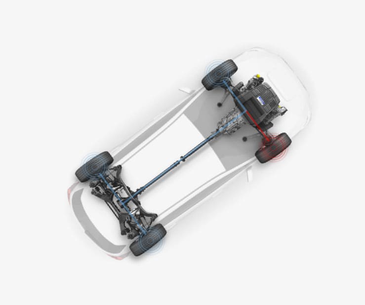 Subaru 左右对称全时四轮驱动系统最重要的特征是传动轴位于中心位置,驱动呈直线左右对称排列在前后轴之间,车辆根据行驶状况自动调整前后轴的扭力分配,各车轮均达到高效的驱动状态,使车辆保持精准操控又增加了抓地力。这样汽车便可更稳地行驶在如雪道、泥泞道路、崎岖不平的山路、湿滑路面及高速公路等多样且复杂的道路状况。